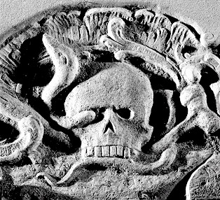ein drastischer Totenkopf, aus dessen rechtem Auge eine